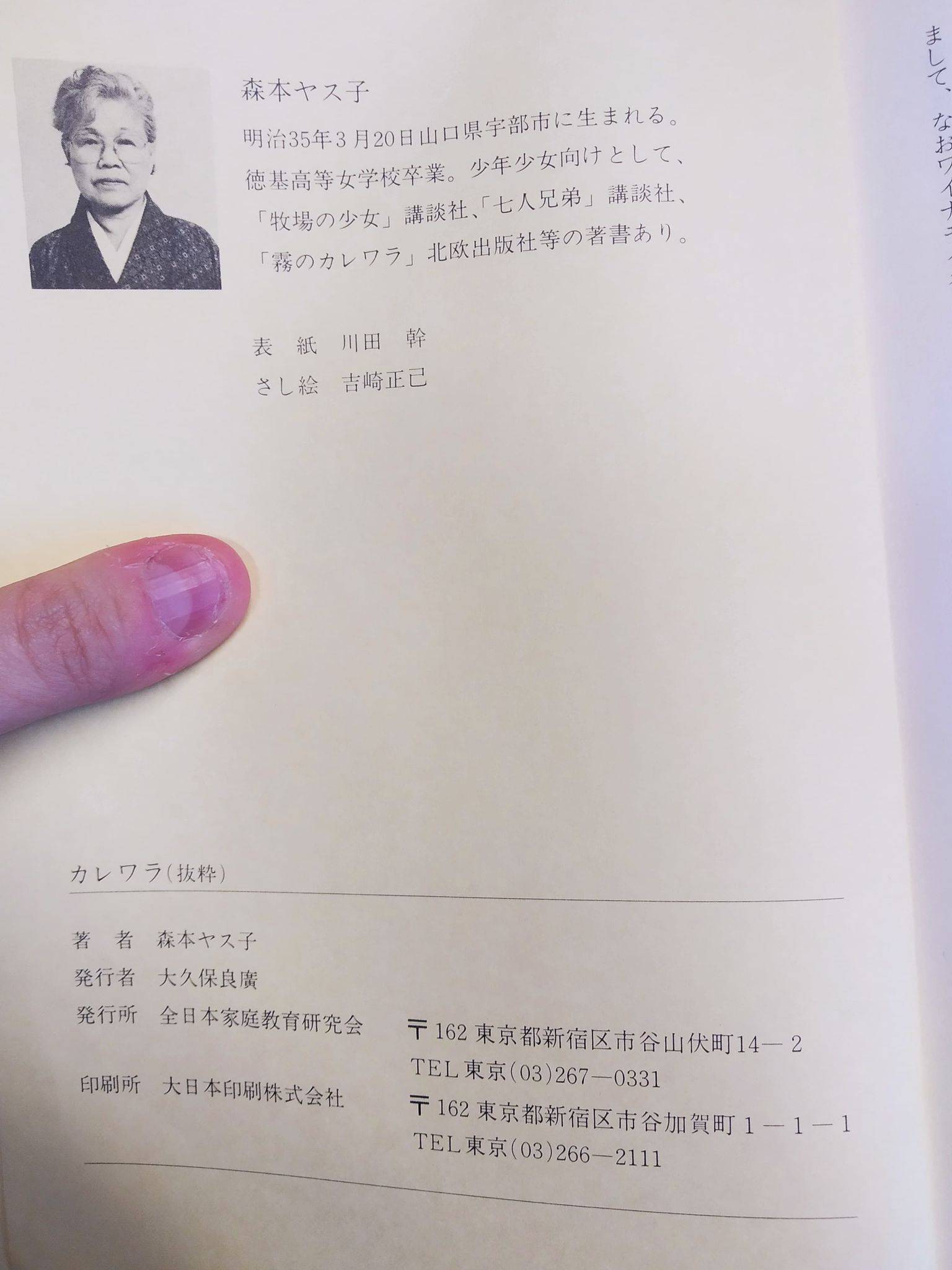 Tämä on otsikkonsa "Karewara (bassui)" perusteella lyhennelmä ja sisältää vain otteen Kalevalasta. Lähettämissänne kuvissa ei ollut mainintaa vuosiluvusta. Ainoa kuvissa näkyvä vuosiluku on Yasuko Morimoton esittelyssä. Siinä kerrotaan että hän on syntynyt 3. maaliskuuta Meiji-aikakauden 35. vuonna eli vuonna 1902.