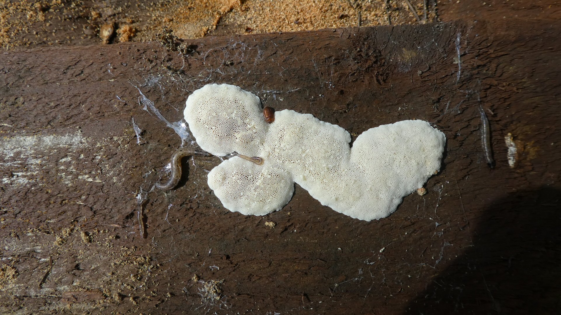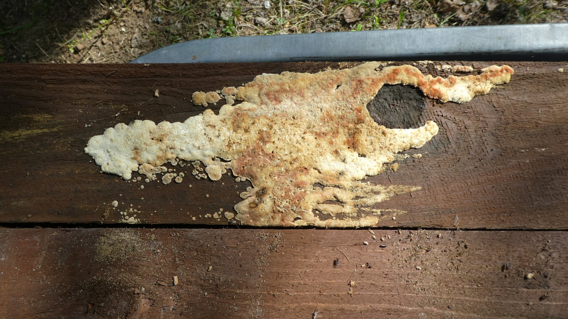 Purin mökillä lautakasan, jonka laudat olin vuosia sitten lahosuojannut. Sieltä löytyi ensinnäkin muurahaispesä, mutta sen lisäksi lähes kaikissa laudoissa oli valkoisia ohuita jälkiä, ja osasta alimpia lautoja löytyi melkoisia esiintymiä ilmeisesti jotain sientä. Mukana muutama kuva. Kuten niistä näkyy, sieni on pääosin valkoinen, mutta yksi esiintymä on osaksi ruskea. Mistähän sienestä mahtaa olla kysymys? Mitä laudoille pitää tehdä?