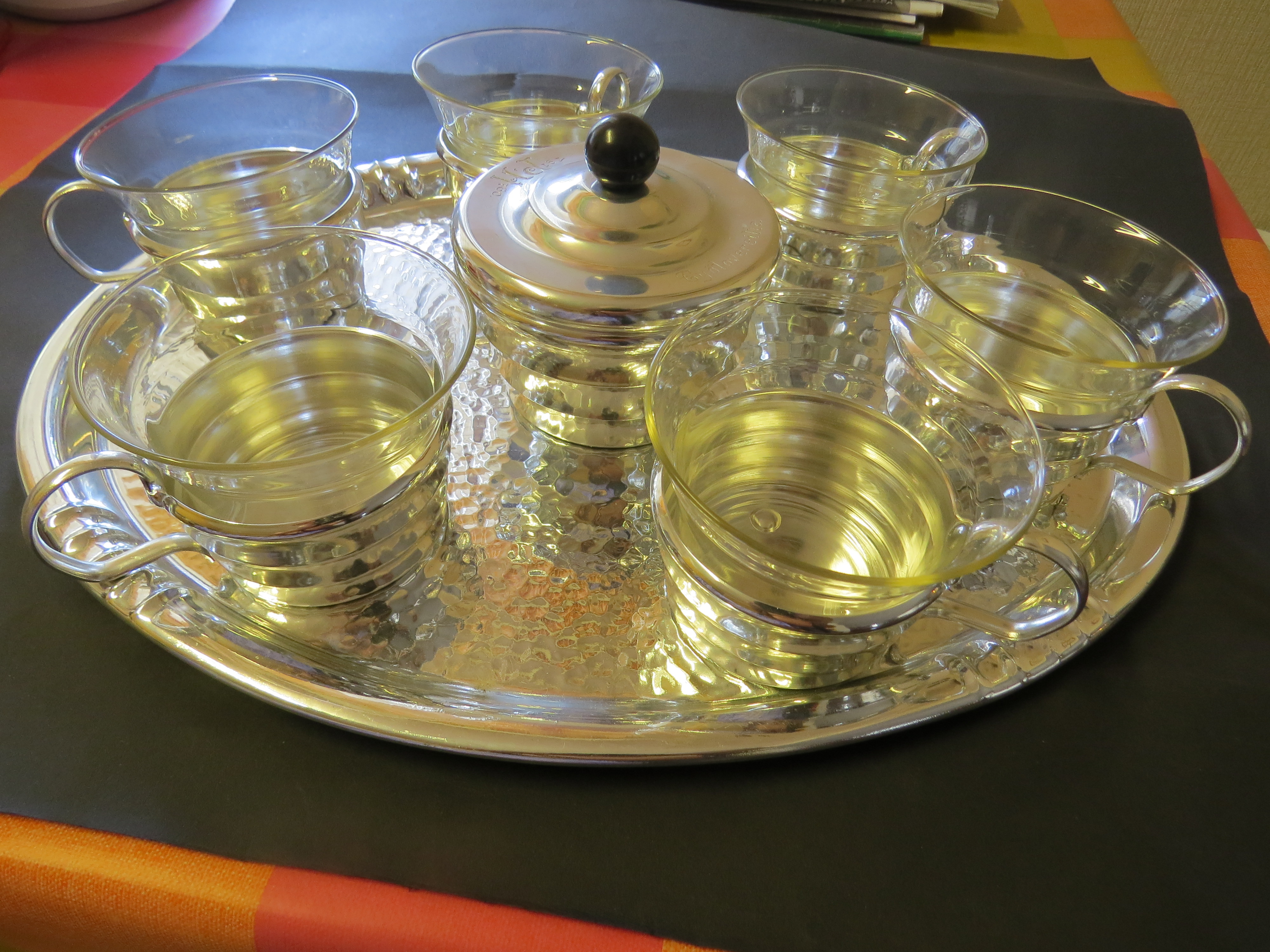 Haluaisin tietoa toti/teelasi astiastosta joka saatu lahjaksi 1960 6kpl ohuita laseja kevyellä (alumin tms. ) alustalla sekä tarjoilualusta. Ilmeisesti Germany, pohjassa lukee Raso Therm