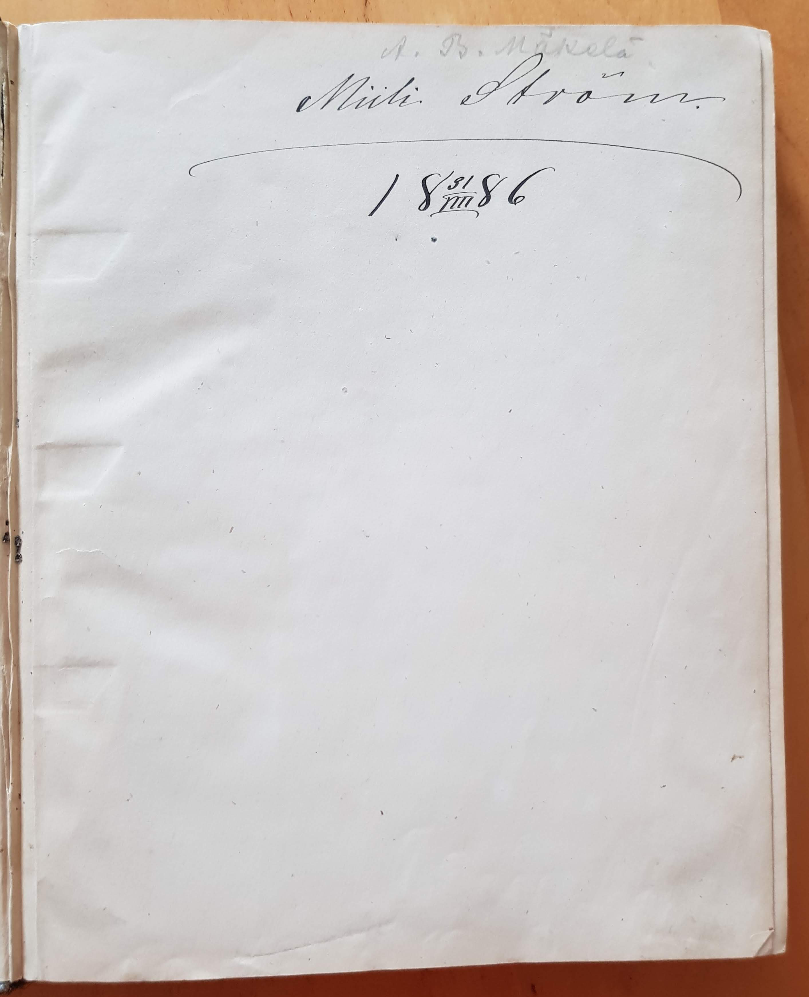 - käsin kirjoitettu kirja ensimmäisellä lehdellä lukee Miili Ström 31/nti 1886 (nti?) kauniisti käsin kirjoitettuna, liekö tekijjä. Sen yläpuolella lyijykynällä A.B.Mäkelä). Kasvatuksen historiaa. Kovakantinen sidottu. Kannet kuluneet. Käsinkirjoitus kaunista ja luettavaa, Kaikki sivut tallella (ss. 92-95 irti, tallella) Sivut numeroitu 232 asti ja tällä sivulla lukee lopussa Kiukaisa 22/III 1886 (kuukausi epäselvä). Kirja jatkuu vielä Kasvatusopilla arv. 30m sivua, joita ei numeroitu.