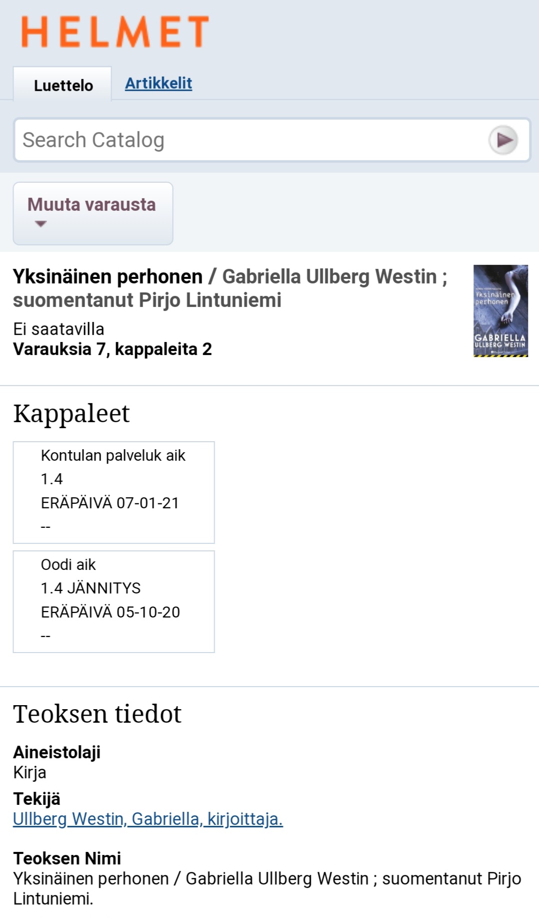 Pitkän laina-ajan kirja on Helsingin palvelukeskuskirjaston kokoelmista. Korona-ajan takia nämä kirjastot ovat toistaiseksi suljettuja, ja lainassa olevat kirjat ovat saaneet pitkät laina-ajat. Kirjasta on toinen kappale, jolla on normaali laina-aika. Kirja on juuri nyt menossa ensimmäisenä varausjonossa olevalle asiakkaalle, mutta kovin hitaasti varausjono tietysti yhden kirjan voimin etenee.