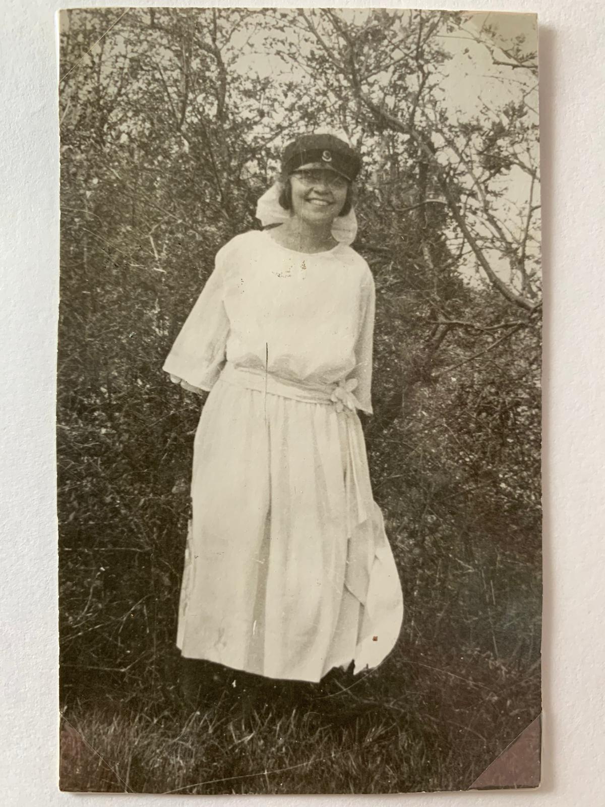 Vanhassa albumissa oli kuva, jossa äidilläni (1906-1958) oli päässä tällainen lakki, ilmeestä päätellen jonkun muun, ilmeisesti miehen, lakki. Kuvaan ei ole lisätty selittävää tekstiä. En ole kuvaa aikaisemmin nähnyt ja paljon vanhempi sisareni ei tiedä tai muista kuvan taustaa. Kiinnostaisi se, mikä lakki on kyseessä, vaikka kuva on niin himmeä, että selitystä tuskin löytyy. Koetin itse turhaan netin kuvahakua. Toinen kysymys on se, mikä on valkoinen harso takana.
