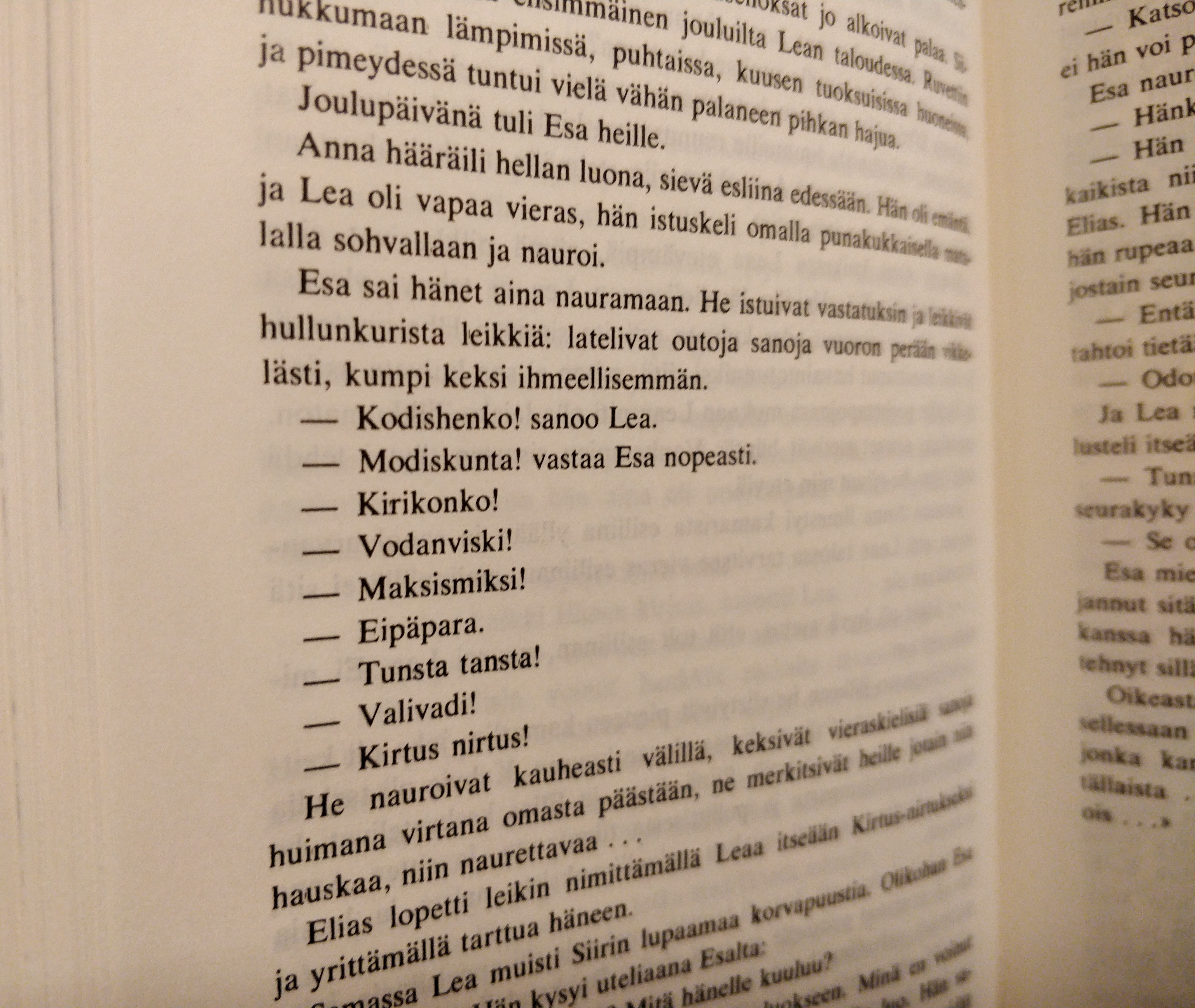 Mistähän romaanista oheinen sivu on? Olen pari vuotta sitten ottanut kuvan hauskasta keskustelusta, enkä merkinnyt muistiin, mistä kirjasta pätkä oli...