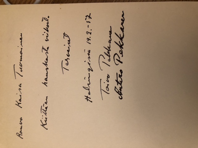 Onko tällä omistuskirjoituksia jollekin jotain arvoa vai laitanko kirjan roskiin? Muuton takia kirjojen hävitys käynnissä.
