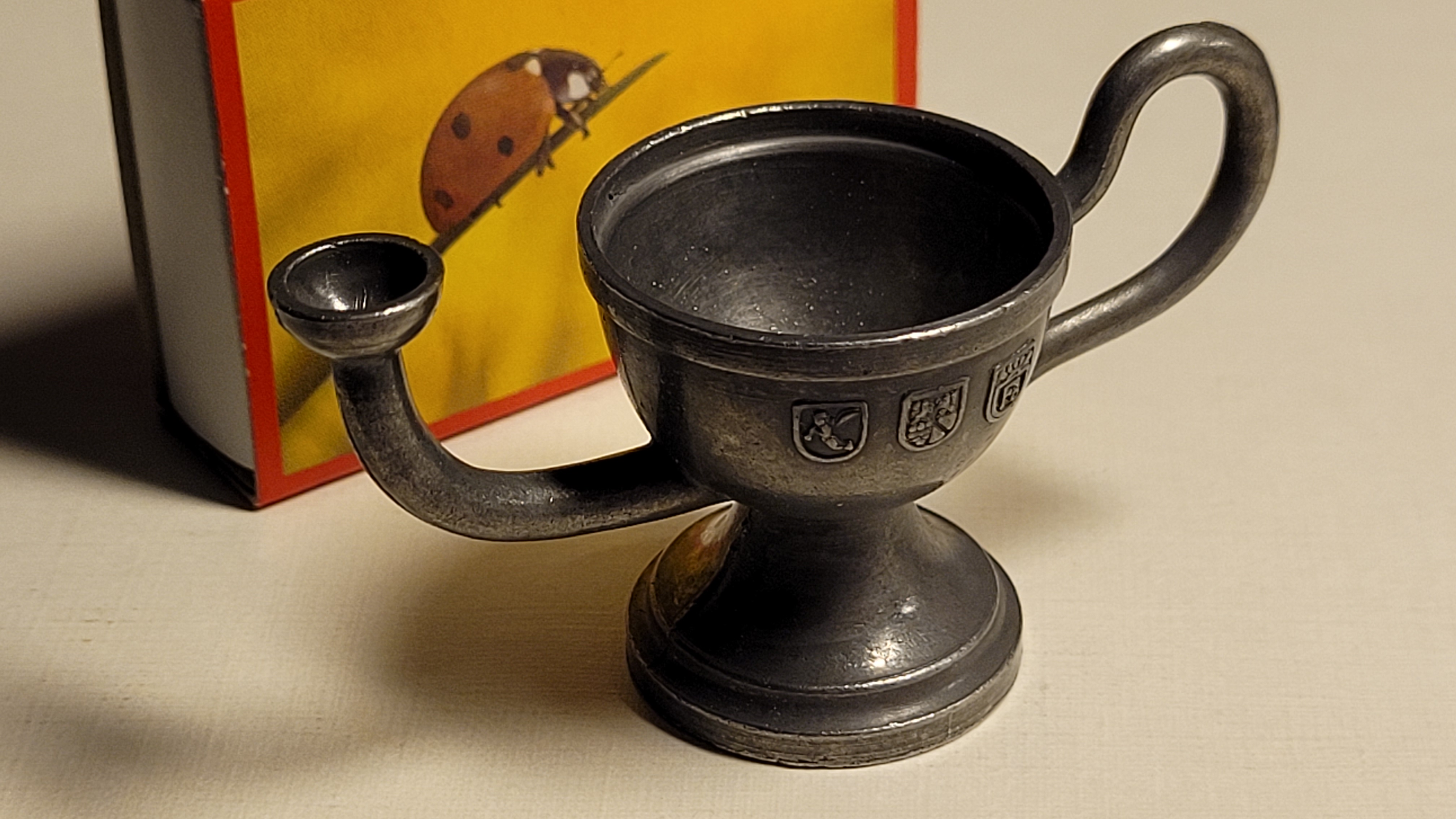 Mikä tämä pieni esine on? Kuppiosan halkaisija on 27 mm, vaakunakuviot ihmetyttävät.