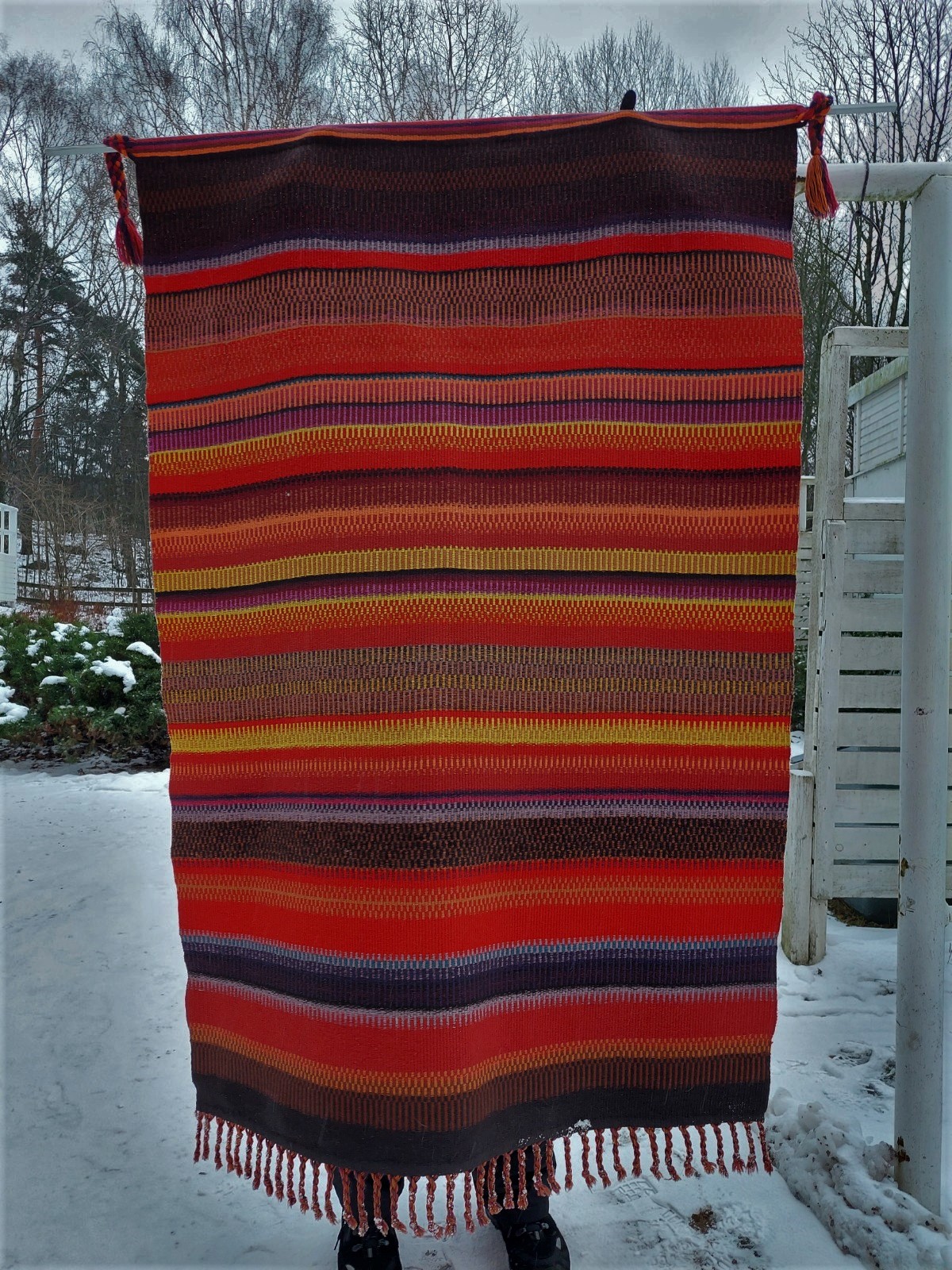 "Meillä ei ole esimerkiksi Montell-Saanion raanukuvastoa, joten perustan arvioni niihin raanuihin, joita Arktinen horisontti -kirjassa on nähtävissä. Montell-Saaniolla on kyllä näköjään hyvinkin voimakkaan värisiä raanuja, ja yläreunan palmikot ovat myös hänen tekstiileilleen ominaisia, mutta tässä kysytyssä raanussa näyttää olevan värillinen loimilanka, kun taas kaikissa edellä mainitussa kirjassa esiintyvissä raanuissa loimi on kaikissa valkoinen. Pikkuseikka toki, mutta voisin kuvitella, että tuollaisella yhdenmukaisuudella on tekijälle ollut jokin arvo tai merkitys. Koska raanussa ei myöskään ole tekijän merkintää eikä asiaa ei voi täysin varmaksi sanoa, niin intuitioni sanoo, että tekijä on joku muu kuin Elsa Montell-Saanio."