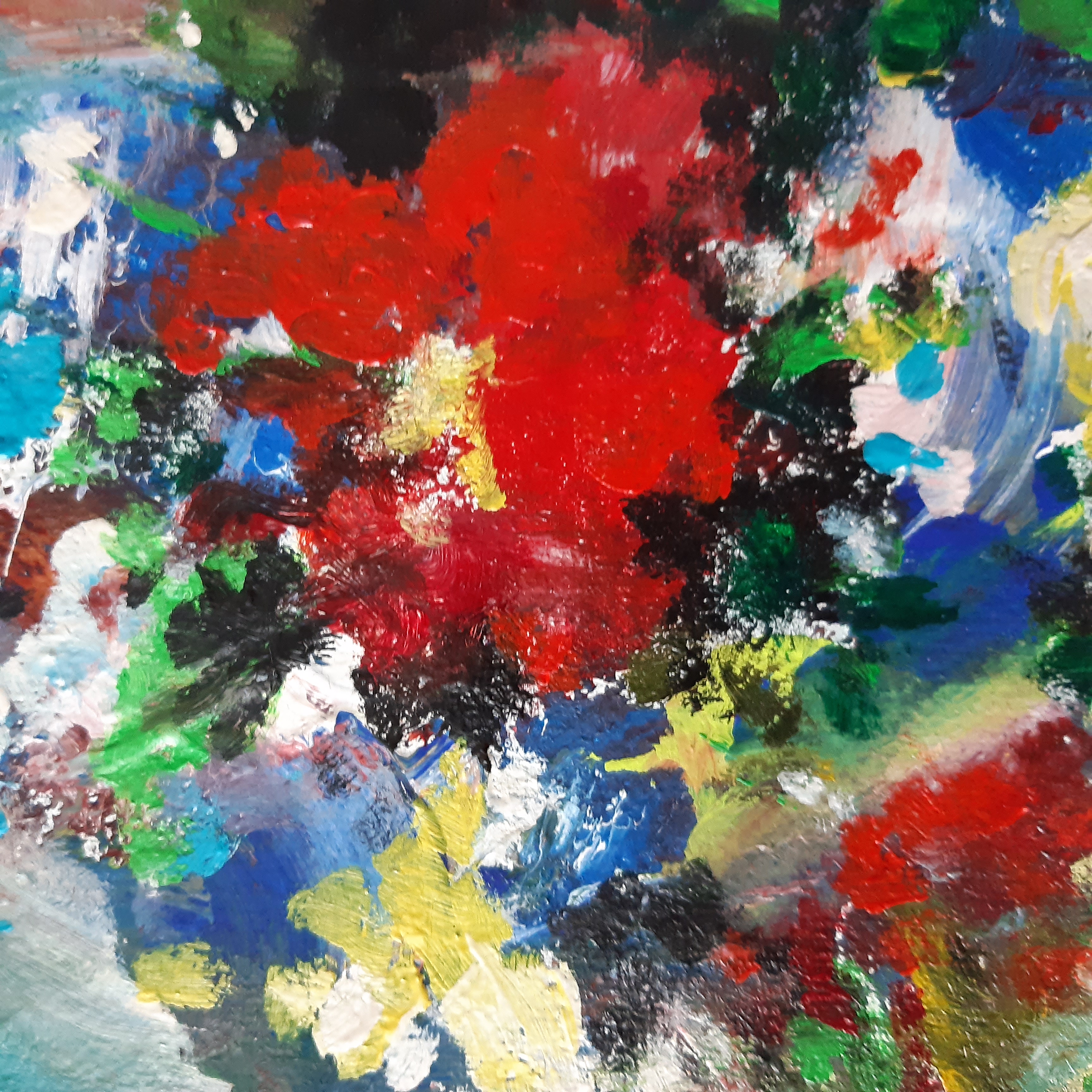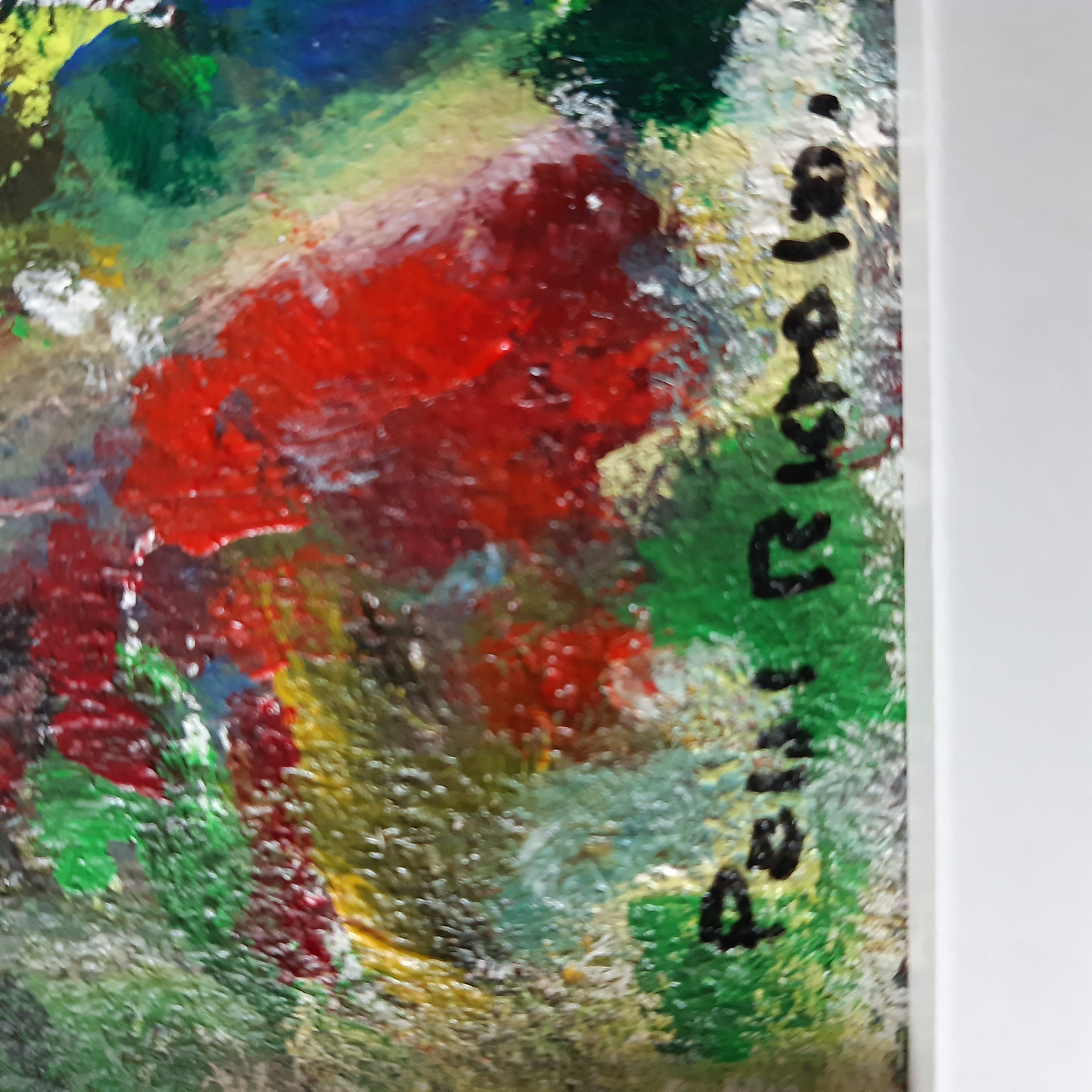 Kenen signeeraus? Pieni kukka aiheinen teos 20*20cm, pohjana huokonen vanha lastulevy, kirkkaat värit - vuosikymmeniä vanha.