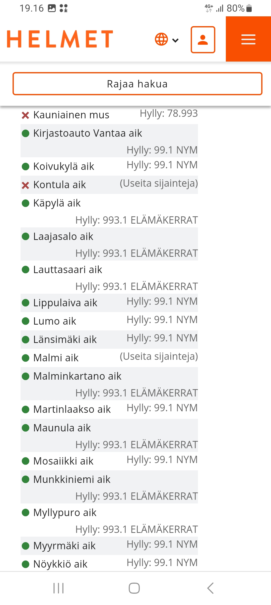 Kirjojen kohdalla lukee välillä hyllyn sijainnin sijaan " useita sijainteja ".