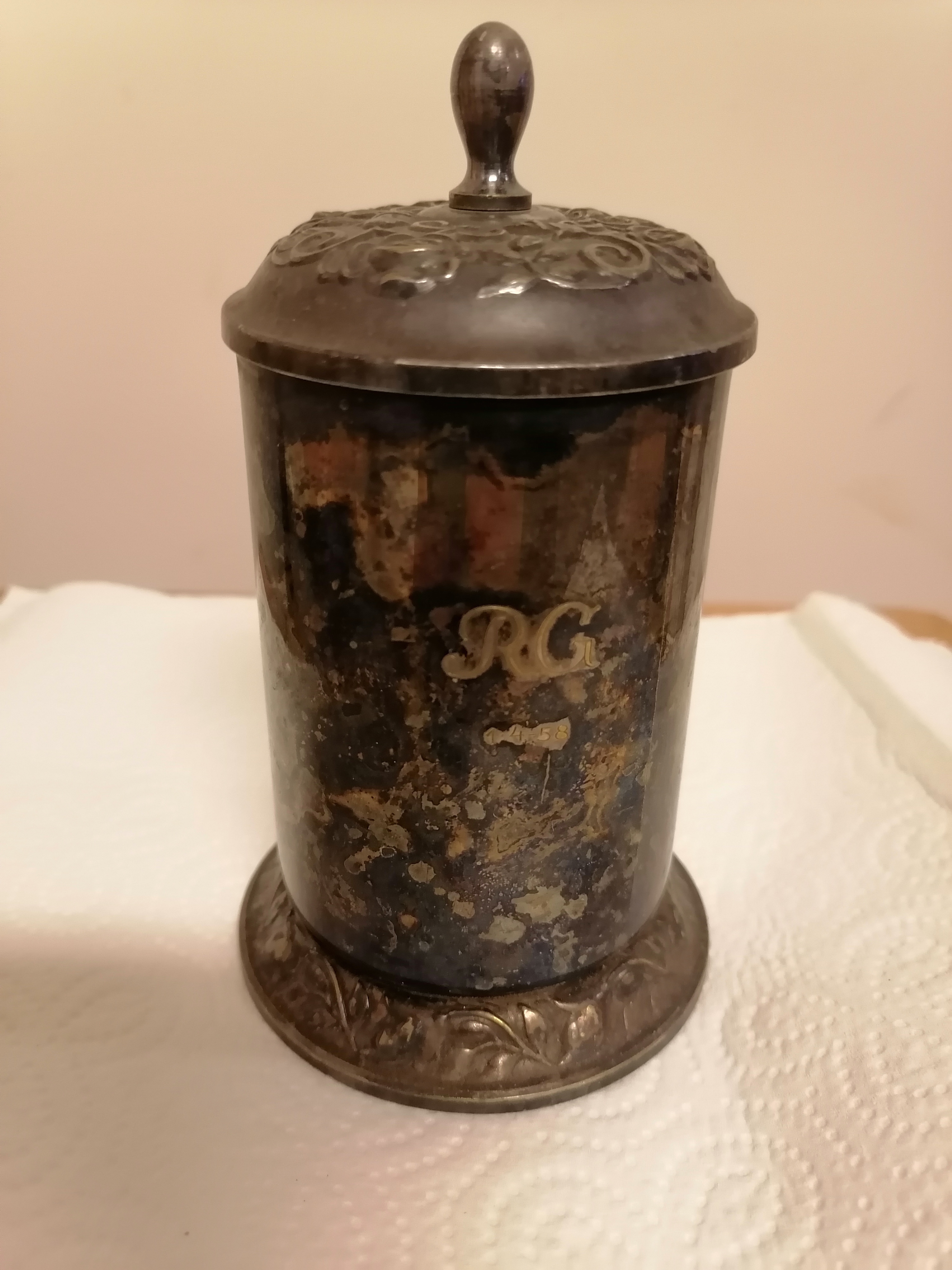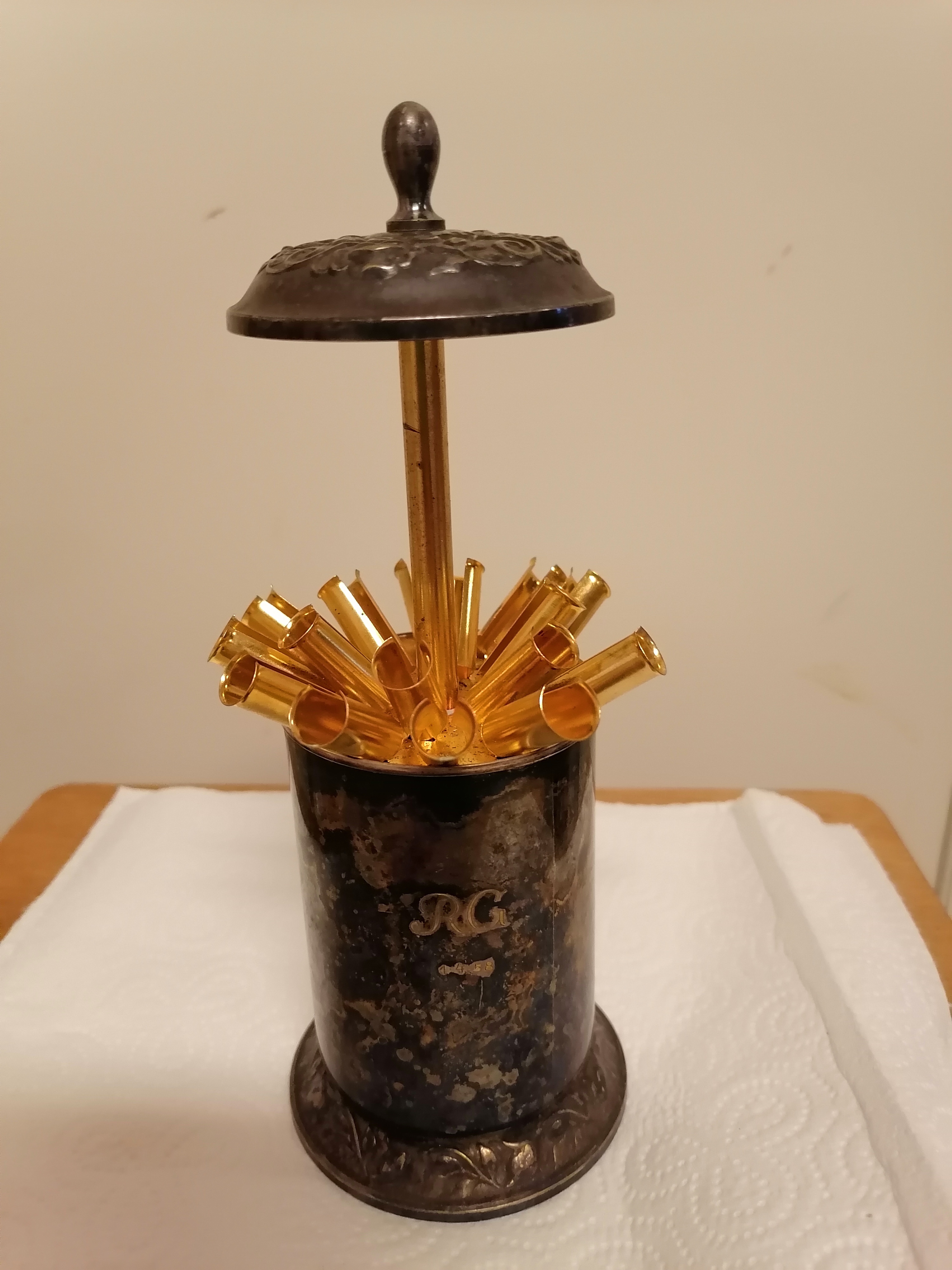 Mikä tämä esine on? Kun kantta vetää ylös, se aukeaa ja tulee esille nuo kullanväriset ulokkeet. Kyljessä nimikirjainten alla numero 1458.